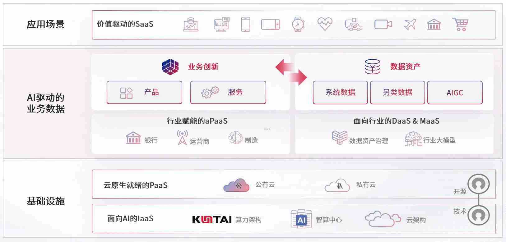 数字时代,,,,围绕企业数字化转型的关键要素,,,,欧陆注册数码开创性的提出数云融合战略和技术体系框架,,着力在云原生、、数字原生、、AI原生和信创产业上架构产品和服务能力,,,,为处在不同数字化转型阶段的快消零售、、、、汽车、、金融、、、、医疗、、、、政企、、、教育、、、运营商等行业客户提供泛在的敏捷IT能力和融合的数据驱动能力,,构建跨界融合创新的数字业务场景和新业务模式,,助力企业级客户建立面向未来的核心能力和竞争优势,,,,全面推动社会的数字化、、、、智能化转型升级。。